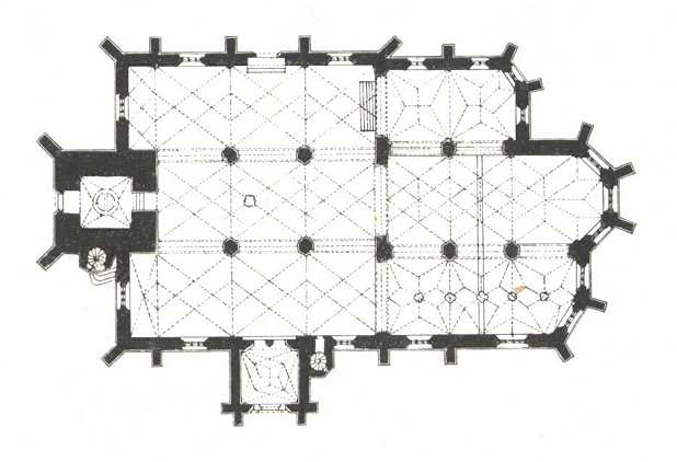A mint már a Fröde felvétele alapján s a XVII. és XVIII. századbeli toldások mellőzésével készült s a 388. lapon látható alaprajzból is nyilvánvaló, a templom mai alakjában a XV. században épült. Az okmányokon kívül azonban egyes részletei is arról tanúskodnak, hogy története a XIII. századba nyúlik vissza.
