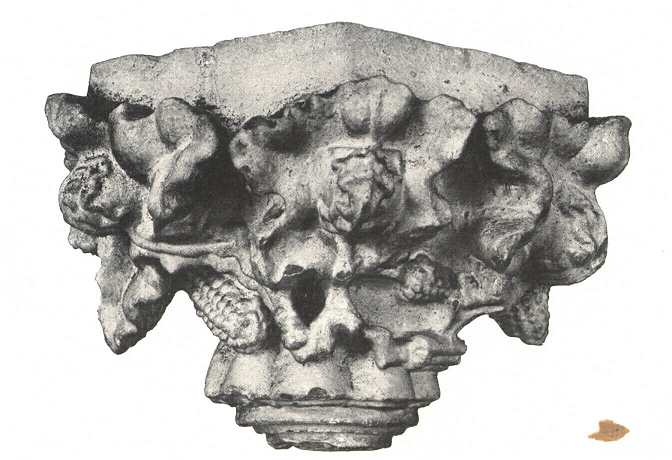 A hajó szabadon álló nyolcszögletes pilléreinek az egyöntetűsége is azt bizonyítja, hogy a midőn a bazilikális szentélyt befejezték s a régi templom déli falának lebontásával kapcsolatban az északit újjáépítették, ennek a befejezésekor eltértek az eredeti tervtől. A már meglevő fal bazilikális elrendezéséhez szabott alacsony ablakait s a belsejét tagozó köteges félpilléreket változatlanul meghagyták, de ezek fölött a falat, megfelelően az ezzel párhuzamosan emelkedő pillérsoroknak s az alapjától újonnan épült déli falnak, magasabbra emelték. A bazilikálisnak tervezett templom tago-zása jóval díszesebbnek ígérkezett, mint a minővé a csarnoktemplom tagozása lett. A három fél-, illetve negyedhengerből összerótt köteges félpillérek díszesen faragott fejezetekkel ékesek s a főhajó diadalívén megmaradt üres gyámkövekhez hasonlóan gyöngén stilizált levél-ékítményekkel bírnak. Az egyik félpillér fejezetén, a melyet a 399. lapon levő képünk ábrázol, szinte naturalisztikus szőlőlombot és gerezdeket látunk, a melyek csak gyakori bemeszelésük miatt tűnnek föl kissé formátlanoknak. Az északi hajónak a diadalív sarkában levő s a félpillérek fejezeteivel egyforma magasságú gyámkövét nagy vonásokkal jellemzett szakállas emberfej díszíti (l. az idecsatolt képet). Ez alighanem az építőmester arc-képe, a ki templomunkat bazilikálisnak tervezte, a kinek műve azonban félben maradt.