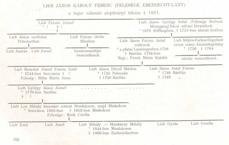 A bártfai Lieb-kódexet Lieb János Ferenc Antal írta, a kinek családi feljegyzései és okmánymásolatai azonban a Lieb-családról föl- és lefelé harmadíziglen foglalnak magukban kimerítő adatokat. A kódex első lapjának a tartalma ez : "Laudetur Jesus Christus. Az egyetlen Lieb János Károly Ferenc 1 639-ben a bajor választó ő fenségének alapítványi titkára (Legations Secretarius volt) s 1681-ben befejezvén földi pályáját, két fiút hagyott hátra. Az első Lieb Ferenc József, a második Lieb János György Antal. Ez utóbbi 1679-ben szeptember 3-án Söfflingben született, a mint ezt a következő keresztlevél másolat bizonyítja". A szószerint közölt keresztlevél után a kódex írója megjegyzi, hogy Lieb János György Antal befejezvén tanulmányait, katona lett s a Schwind gróf-féle ezredben hadnagyságig vitte. Leköszönvén rangjáról, 1706-ban Schwäbisch Gmünd-ben megnősül s a város főbirájának leányát, Möszgang Mária Barbarát veszi feleségül, a kitől hét gyermeke született. Ezek azonban két fiú és egy leány kivételével meghaltak ; a két fiú pedig idővel külföldre szakadt.