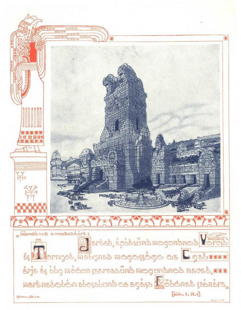 MÁRKUS GÉZA rajzolta e füzet második mű-mellékletét, amely a bábeli torony építéséről szóló bibliai sorokhoz készült. Kétszínű nyomásban reprodukáljuk. Ugyancsak Márkus Géza tervezte Kecskemét városának bérházát, amelynek képét a szükséges részletekkel együtt-e füzet 345., 348., 349. és 352-ik oldalain találja az olvasó.