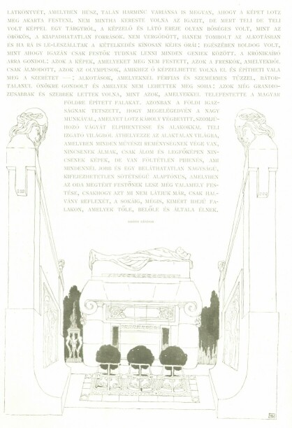 Mert ez a magyar faj, minden népek között a legbrilliánsabb, minden nemeset a leghama-rabban átérző, zseniális faj, megmagyarázható okokból, - - Lotz korában, majdnem egészen értelmetlen annak megítélésében, mennyiben nélkülözhetetlenül szükséges alkatrésze az államalkotás kiépítésének, ipari és kereskedelmi fejlődésének, a nemzeti élet gazdaggá és naggyá tételének az általános művészi nevelés, és ennek híján teljesen tájékozatlan a művészet értékének megítélésében. Nem a faj hibája ez. Oka egyszerűen az, hogy neveléséből a nevelésnek ezen része hiányzik és ezzel hiányzik az a kapcsolat a művész és közönsége között, amely kapcsolattal együtt fejlődhetik csak a művészet úgy, hogy az az államélet közhasznú tényezőjévé váljék.