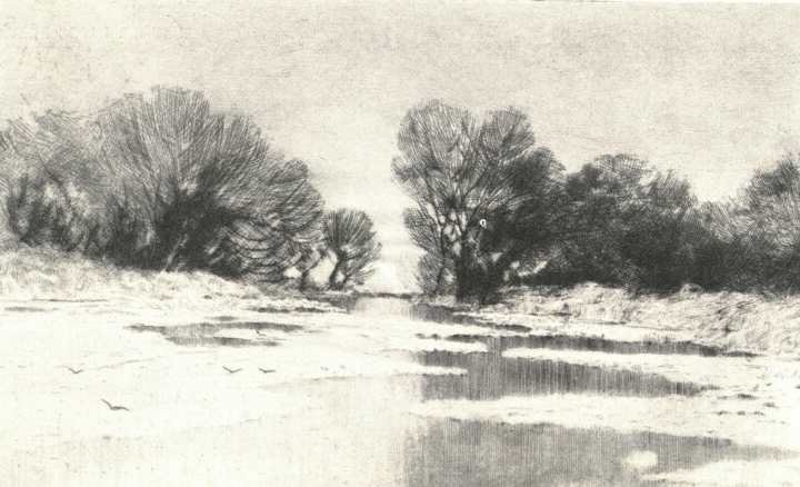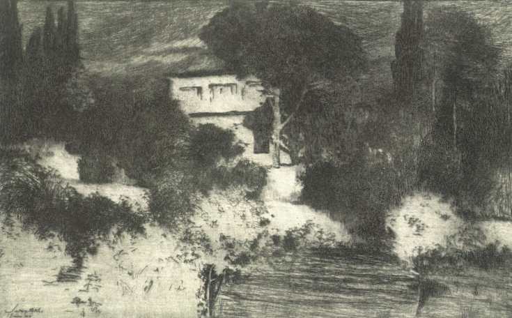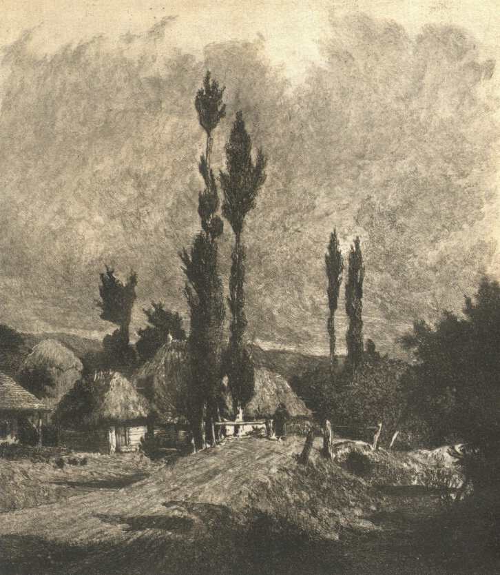 És végül egy másik érdekes jelenség is megmagyarázható ebből a szabadságból. A rézkarc művészei feltűnően sokat vesződnek szimbolikus vonatkozásokkal, testetlen érzésekkel, olyan spekulációkkal, amelyek már túl vannak az elmondhatóság határán, a filozófiának, mondhatni, az ultraviolett sugaraival, amelyeket csak érezni lehet, mint valami mellékízét a pozitív igazságoknak és csupán a megérzésük által kiváltott hangulatokkal lehet őket kifejezni. Ilyen festői filozófiák minden erősen gondolkodó fejű piktorban benne lappanganak, s a rézkarc módot ad nekik arra, hogy teljesen matéria nélkül, dematerializálódott vonallal és tónussal elénekeljék ezeket a miszteriózus érzéseket. A festményben ott van a szín, amely minden esetben ad valami naturális ízt, valami földszagot a dolgoknak, ellenben a testetlen vonal, amelyet akkor hagynak félbe a rézkarc szabadságánál fogva, mikor éppen elég a szimbólum mögött rejlő transzcendentális érzések kifejezésére, ez az anyagtalan valami egészen az anyagtalanság eszközének van teremtve. Természetesen itt mindig kényes pontokra ér a művész, mert a szavakban kifejezhetetlen filozófiáról könnyen átsiklik a szavakba foglalható filozófiák illusztrálására, tehát a szimbolizmusból belepottyan az allegóriába, de amíg ezt az irodalmi fertőzetet el tudja kerülni, addig izgatóan érdekesek maradnak ilyenfajta tépelődései.