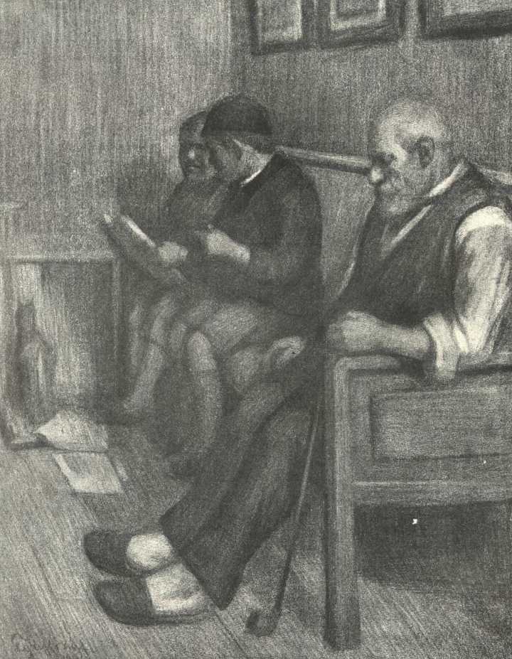 A címkóros feltűnő figyelemmel néz a képre s ez elég ok arra, hogy jól szemügyre vegyük őt magát. Azt mondtam, hogy a képre néz, ez még nem jelenti azt, hogy a képet nézi. Nem, ő a kép címét olvassa oly figyelmesen, mert azt hiszi, hogy az a fontos Teszem azt, a már említett 516-os kép címe: "Utolsó óra". Szegényes szoba, az ágy szélén egy asszony ül s a párnák között egy gyerekfej látszik. A kép roppant tetszik a mi barátunknak. Miért? Mert oda van írva: "Utolsó óra". Az ő jó szívében lejátszódik a korai halál nagy tragikuma, az anya fájdalma s a halálról való minden bánatos képzete. Lelki emóciót érez, meg van hatva s ezt a kép okozta. Tehát a kép jó - - neki legalább jó. Hát ezt a derék embert a piktor egész egyszerűen becsapta. Az egész "Utolsó óra" meg se volt festve, csak oda volt írva alája, címnek.