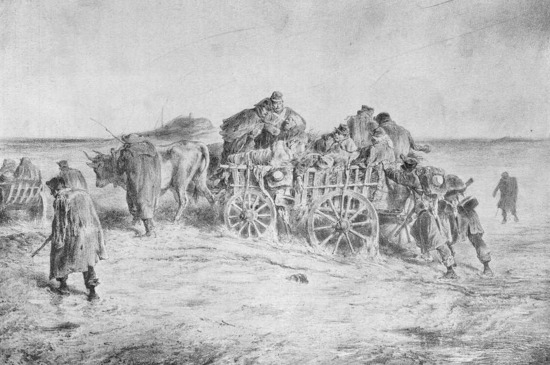 Esőbe, ködbe borult alföldi tájat szemlélünk, vonul az ökrös szekér sebesültekkel agyonterhelve. A jó állatok nehezen cammognak, a kerekek mélyen kátyúba vágódnak s a küllőkről csorog a folyékony iszap. A kocsiban hivatása teljesítése közben pillantjuk meg az orvost: orvosságot készül nyújtani egy sebesült vitéznek. Ázott-fázott, köpenybe burkolódzó, didergő alakokat látunk. Köröskörül senki, semmi. A háttérben egy kunyhó teteje és gémes kútnak rúdja látszik. Végtelen szomorúság, megkapó gyászhangulat tükrözik e lapon, nem kell hozza érzelgős kedély, ha az ember sokáig szemléli, úgy veszi észre, hogy szeméből egy könnycsepp lassan kicsordul...