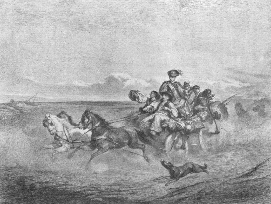 A harcba induló újoncokat ábrázoló képén, melyet - - sajnos - - csak Greux metszete nyomán ismerhetünk5 (eredetije nagy összegen New-Yorkba, Vanderbilt tulajdonába került). - két pej és egy szürke vágtat szinte pega-zusi szárnyalással előre és rántja magával a szekeret, mely a harcba induló vitézeket szállítja. Mámoros öröm tükrözik az arcokon. Ostor pattog. Az egyik alak "Hajrát" kiált, a másik lelkesülten veri a dobot. Mintha Petőfi múzsája zúgott volna a művész fülébe: