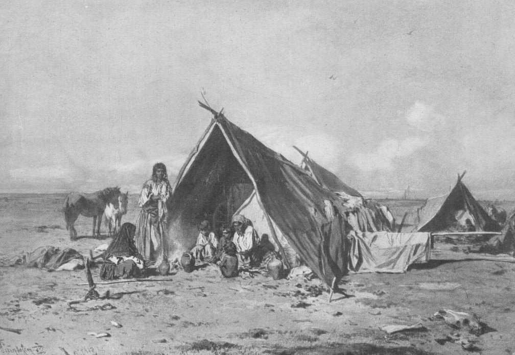 Cigányokat ábrázoló képei közül talán legkorábbi az 1855. évszámmal jelzett. A cigány vonzotta őt határozott faji jellegénél, festői viseleténél, szokásainak, életmódjának nagy-szerű eredetiségénél fogva. A cigány az Alföld beduinja. Bár nincsen semmijük -- szegények, mint a dervis a pusztában, van azonban lyukas sátruk, kalyibájuk, mely ürgelakhoz hasonló, egy-két gebéjük, sok gyerekük, örvendenek az életnek és élvezik azt. A cigány, ha jól esik, horkol egyet, ha meleg bántja, megfürdik a patak-vízben, ha éhes, majd csak kerül valami a fazékba. A bécsi művészettört, gyűjteményben egy aquarell van ez időtájból. Viharverte, eső áztatta sátrat látunk, a sátorban tűznek pislogó lángja mellett cigányasszony ül, három purdéja környezi, a sátron kívül vén cigányasszony kuporodik, kezeit melengetve a tűz fölött, odább fiatal cigányleány támaszkodik a sátor széléhez. A háttérben távolabbi sátrak, egy-két gebe látszik. Csodás kék ég, lágyan úszó felhőkkel képezi a levegőt, melyet pacsirták szelnek. Ugyanezen motívum némi változással (a kezeit melengető öreg asszony helyett pipáját tömő férfi, a fiatal cigány leány helyett gyermekét szoptató anya, a háttér elrendezésében is némi különbség) létezik olajfestményben is.10 Hasonló mű van a berlini Nemz. képtár tulajdonában: pusztán tanyázik a cigánycsalád ponyvával fedett szekér mellett, melynek kifogott lova gyéren szénázik.