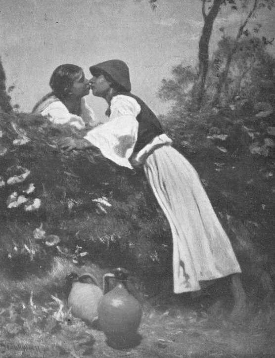 Van azonban még egy válfaj, az idilli jellegű szerelmi jelenetek csoportja. Ezen Watteau-szerű műfajban többször kísérletezett. A bécsi művészettört, gyűjt.-ben van a "Csóko-lódzó szerelmes párt" ábrázoló képe.11 Némileg erőltetett helyzetben látjuk a fiatal magyar legényt és leányt, amint egy töltésszerű dombon áthajolva csókolódznak. E képet 1863 tájára helyezik. Ugyancsak Bécsben a Modern Képtárban föltaláljuk némileg bővített alakban megfestve ugyanezen tárgyat. Ez a másik fajtájú "Légyott"-ok tipusa. A csókolódzó párhoz két ló járul, egy pej meg egy szürke, s a szerelmes ifjú az utóbbin ülve hajol át, hogy mátkáját ölelje. Budapesten Wodianer báró tulajdonában van azonos tárgyú kiváló alkotása a mesternek. Magyar legény kedvesével beszélget, szürke és pejló az előtérben, a háttérben parasztház teteje látszik.12 Meleg tónusú napsütéses kép sötét és világos foltokból ösz-szetéve.