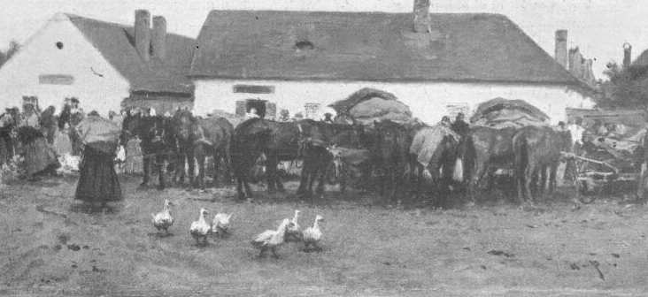 Tömérdek nép gyűlt egybe, s minden irányból seregestül hozták ide a terményt és ipari cikket. A mai városháza előtt elterülő főtér volt akkor a piac helye, de tágasabb és terjedelmesebb volt, mint manap. Az árusítók helyei nem voltak pontosan megszabva, mindenki ott ütötte föl nagy gyékénynyel borított sátrát, ahol éppen jónak találta. Eltűnt a Mária-oszlop is, e kedves barátságos obeliszk, mely Pettenkofen képein oly gyakran fordul elő. Ő vált Kolumbusává e darab földnek, ő födözte föl népének, éghajlatának szépségét s a kis alföldi város kezdett híressé lenni művészetének meggyőző ereje folytán.