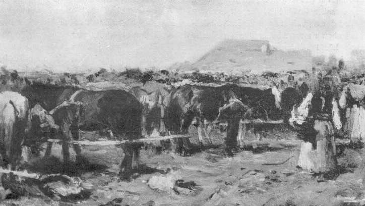 Pettenkofen kedvelte e gebéket, melyek rosz-szak voltak ugyan - - csontjaik zörögtek -azonban színben érdekesek, erősen veresbarna árnyalatúak. Tetszett neki pusztai természetességük, éppen úgy, mint Fromentin az arabs ló graciózus vonalán lelkesült.