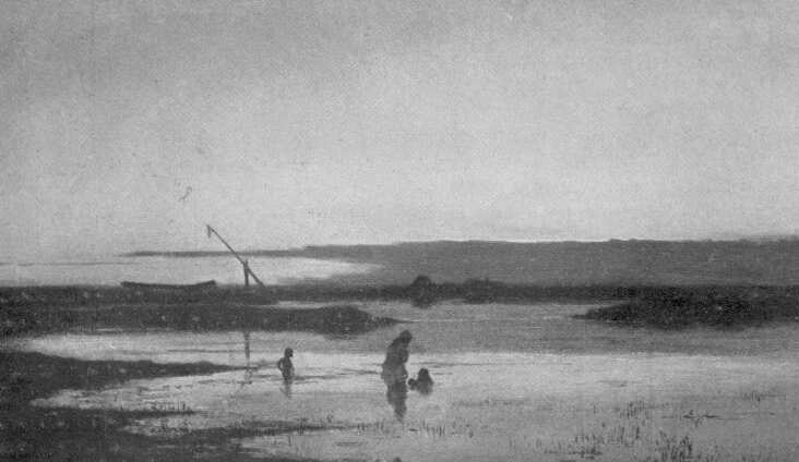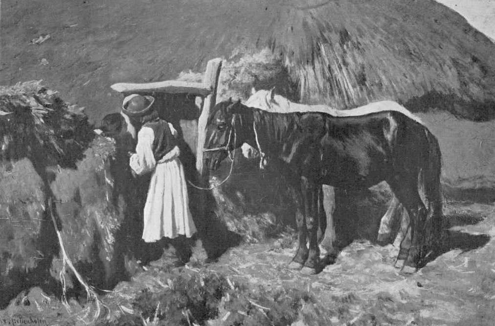 Vagy nézzük a "Disznó-csordát". Pásztor, vállán subával, falu végén disznókat hajt. Esőbe borult hangulat. Minő igazság, mily megkapó hűség! Ez az egykori lovas-tiszt mélyen belelátott a magyar nép leikébe. Az újabb művészetben talán az egyetlen Millet, aki maga is paraszt volt, vetekszik vele fölfogásának mélységére és igazságára nézve, melylyel a parasztnép életének józan és egyszerű nyilvánulásait kifejezni tudta.