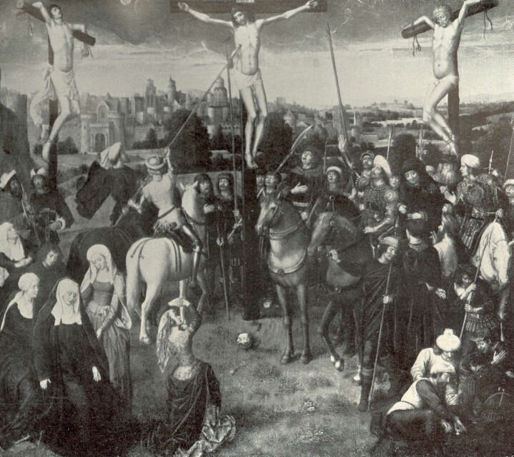 Amilyen könnyen megállapítható azonban e kép szerzoje, épp oly nagy nehézségekkel kell megküzdenünk akkor, ha egy másik és ezuttal nagyon is kiváló festmény alkotójáról akarunk beszámolni. A kép (689. sz.) az imént leírt Madonnával szemben függ és a Golgotát abrázolja. A Megváltó és a jobboldali lator mar kilehelték lelküket. A baloldalit most végzi ki bárdjával a hóhér. Lent a bal sarokban az ájultán összeroskadt Mária, Sz. János és a gyászoló asszonyok csoportjában. Magdolna könnyeit szárítva térdel a kereszt lábánál. Jobbra lóháton a megtért centurió és egy másik főember. Megilletődött arcukról és kézmozdulataikról látjuk, hogy igen komoly szavakat váltanak egymással. A nézőhöz közelebb álló őszszakállú tiszt a Megváltóra tekint. A másik feléje fordul, miközben Krisztus kiszenvedett alakjára mutat. Egy lovas a kép szélén összeszorított ajakkal és komor tekintettel néz maga elé, hátat fordítva az egész környezetnek. A jobb sarokban álló két gyalogos katona az ártatlanul kivégzett áldozatra tekint.