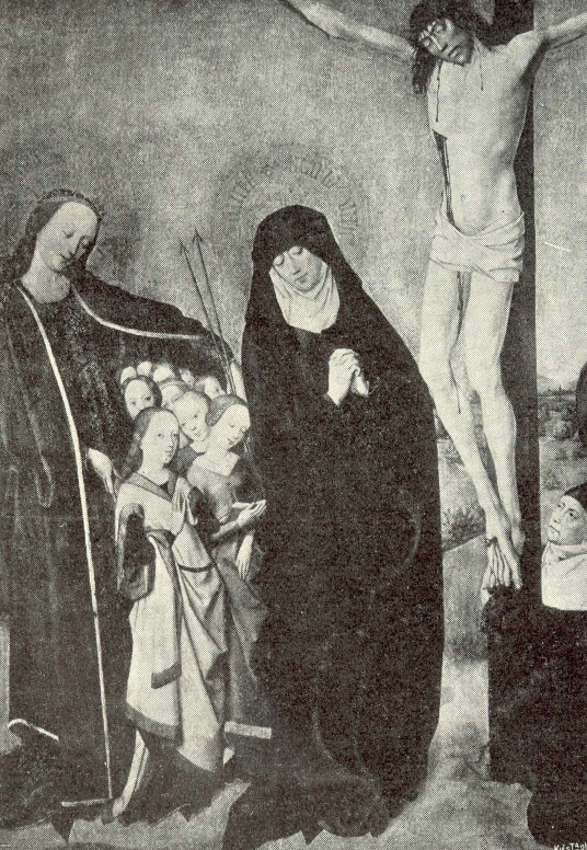 Az architektonikus háttér, a képünkön látható fogalmazásban, gyakran alkalmazott motívuma a mesternek. A müncheni képtárban, a Mária templomba menetelét ábrázoló festményen (24. sz.) egy csúcsíves templom átmetszését látjuk. Ugyanazon gyűjteményben Sz. Jakab apostolt és remete Sz. Antalt hasonló kápolna boltívei alatt ábrázolta a művész (37., 38. sz.). A Firmenich-Richartz-féle megállapítás hitelessége könnyen igazolható más stílkritikai bizonyítékok alapján is. így pl. Mária feje megegyezik Sz. Orsolya azon típusával, mely egy Krisztust a kereszten ábrázoló müncheni képen látható (34. sz.). (1. az itt közölt képet.) Nemcsak a fej tartása azonos mindkét helyen, hanem még a korona elhelyezése is, amint az hajlásával a koponya formáihoz illeszkedik. Ugyanezen női típus előfordul még a müncheni "Krisztus szüle-tésé"t-n is (32. sz.), hol összehasonlításra kínálkoznak a gyermek alakja es a szövetek hosszú és keskeny hajtékainak egy es vonalai, stb.