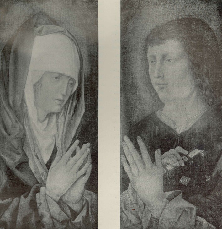 Németország legnagyobb művésze is a frank iskolából való és azon alapra épít, melyet nagy előde, Schongauer rakott le. Egyénisége azonban annyira kiemelkedik környezetéből, hogy a colmari atyamesterén kívül alig hasonlitható egy -két német műveszehez, Ezek közül való a Wolgemut-iskola azon tagja, ki a nürnbergi "Peringsdörfer-féle oltár"-t festette és akit Thode6, meggyőző bizonyítékok alapján, a korán elhunyt Wilhelm Pleydenwurffal azonosított. Wolgemut ezen tehetséges segédének sikerült nyomokat hagyni Dürer ifjúkori művein és gyűjteményünkben látható két szerény emlék, mely magán viseli az egy iskolában nevelkedett két kiváló ember egyéniségének bélyegét. Mária és János evangélista, mellen alól ábrázolt alakjairól szólunk ezúttal (717., 718. sz.). A kis fatáblák valamely nagyobb mű töredékei lehetnek. Valószínűleg egy Krisztust a kereszten ábrázoló képhez tartozhattak. Máriát összetett kezekkel, félig jobbra fordulva látjuk, amint lesütött szemekkel maga elé tekint. János félig balra fordul; jobb kezével könyvet szorít melléhez, balját kissé felemeli. A két alak tehát a kereszt két oldalán állhatott, egymással szemben. Hátterük nem felelhetett meg a mostaninak, mely azon időből való lehet, midőn az eredeti ábrázolást darabokra fűrészelték és kisebb ájtatossági képeket csináltak belőle. A restaurátor barna alappal látta el őket és zöldessárga dicsfényt festett a fejek körül, kevés gonddal, amint az észrevehető Jánosnál, hol a későbbi ecsetvonások eltakarják a haj fürtjeinek egy részét. A ruházaton és a fedetlen részeken is kevés az eredeti. Az alapformákon világosan megkülönböztethető a Dürer és Pleydenwurff után végzett tanulmány nyoma. Mária feje nagyjából megegyezik Magdolnának azon típusával, mely Dürernek a Germanisches Museumban őrzött Krisztus siratásán látható. A Szűz magas homlokát fehér kendő takarja, elborítva a szemöldököt is. A nagy szemgolyó, az áll kerek végződése es a kicsiny szárnyakkal ellátott, rövid és keskeny orr alapformái azonban már annyira stilizáltak, amennyire Dürer nem szokott eltávolodni a természettől. Hasonló Madonnafőt látni egy "Menekülő Sz. Család"-on a drezdai képtárban. Az utóbbi festmény egy sorozathoz tartozik, melyet Thode, annak idején alaptalanul az ifjú Dürer művei közé akart sorozni. - A szem külső szöglete felfelé hajlik; a könygödör túlságosan kifejlett és nem tapad szilárdan a szemüreg széléhez. Az utóbbi sajátosságok gyakran észlelhetők Dürer ifjúkori festményein. A kéz szerkezete mindkét képen laza. Tagoltsága erősen éreztetett. Rajza felületes és az ízületek megjelölése gondatlan. Az ujjak széles bütykökben végződnek.