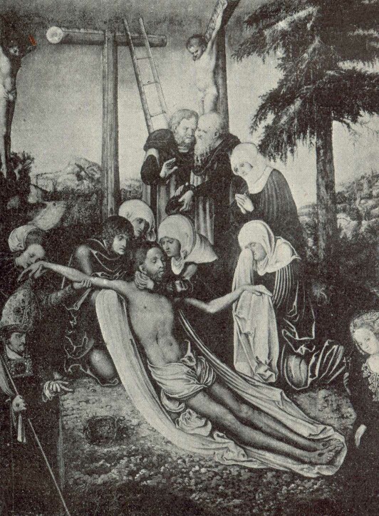 A mindenki előtt ismerős, de valójában kevés embertől ismert Cranach művészetét gyűjteményünkben is több festmény képviseli.11 Az idősebb Lucástól, a wittenbergi műhely vezetőjétől valók ezek közül: "Krisztus siratása", "Mária a gyermekkel szent nők társaságában", a."Szerelmes agg nő" es legalább részben "A házasságtörő nő". Az első (729. sz.) a mester legjelentősebb művei közül való az l514— l515 körüli évekből. Kompozíciójában, mint Cranach-nál rendesen, hiába keressük a mozdulatok gazdagságát és ennek érdekében a tér célszerű kihasználását. Az alakok az előtérben és a középen három síkban helyeztettek el. Krisztus holtteste ferde irányban terül el a földön, csaknem párhuzamosan a mögötte térdelők sorával. Nagyobb dicsőségére válik a képnek a józan és erőteljes festői munka, a mintázás a kellemes, átlátszó barna tónusokkal.