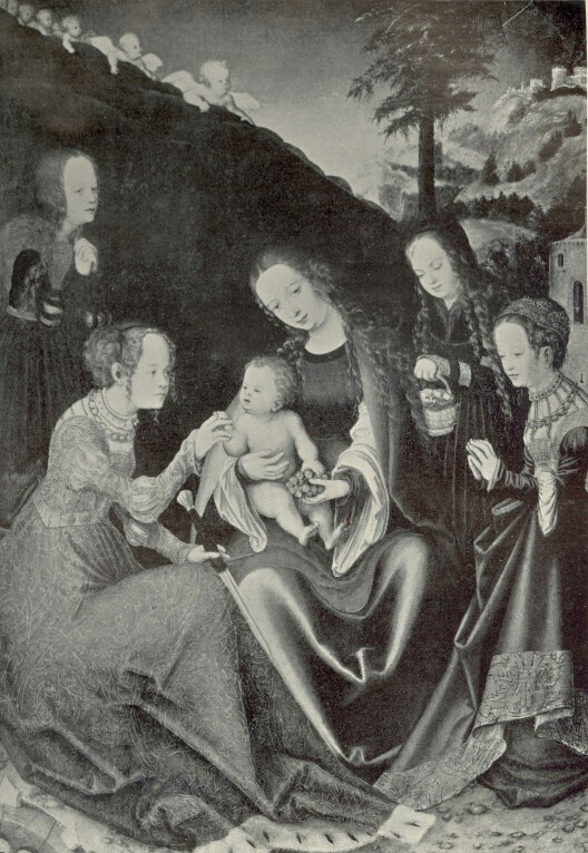 A szent nőktől körülvett Máriát gyermekével (728. sz.) együtt úgy ábrázolta a művész, amint a kisded gyűrűjét Sz. Katalin ujjara húzza. A kép a XVI. század tízes éveinek végéről való, de élénk színhatása újabb keletű átfestés eredménye. A restaurátor műve a sötét felhőtömeg is Sz. Katalin mögött, tetején a gyermekangyalokkal. Eredetileg fekete függöny lehetett ott, mely legkevésbbé sem festői motívum, Cranach képein többször előfordul. Műhelyképek: "A házasságtörő nő" (698. sz.), a 710. sz. alatti "Madonna" és "Herodias" (726. sz.) Az elsőn néhány kitűnően elemzett és mintázott rész bizonyára magától a mestertől származik. A 719. sz. kép, mely egy szerelmes aggastyánt ábrázol, amint egy ifjú nőt ölelget, ki ezalatt a nevetséges udvarló erszényébe nyúl, Flechsig szerint nem az idősebb Cranach műve, hanem Hans nevű fiáé, kitől mindazon festmények származnának, melyeket a művészettörténet Pseudo-Grünewald elnevezés alatt ismer. Ha e képet a formájában és tartalmában rokon ábrázolással, a "Szerelmes agg nő"-vei (722. sz.) összehasonlítjuk, a két festmény stílusában határozott eltérést állapíthatunk meg. Az utóbbinál pl. a mintázás szintén barna színekkel történik, az előbbinél pedig kékes szüírke tónusokkal, ami az összes Pseudo-Grünewald-festményékre nézve jel-temző, a "Szerelmes aggastyán "-nak egyik ismétlése (711. szám), mely Flechsig véleménye szerint szintén Hans Cranach műve lenne, a gyengébb műhelyképek, vagy másolatok közül való.