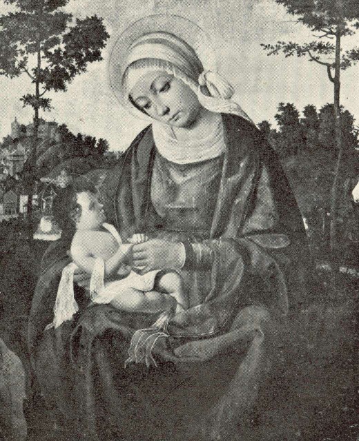 A Szépművészeti Múzeumnak van egy, az Esterházy-gyűjteményből eredő Madonna-képe, a 93-ik számú,2 amely Previtali keze munkája. Ez is deszkára van festve, mint legtöbb képe. A kendővel övezett fejű, fatönkön ülő Madonna az ölében fekvő gyermek Jézus fölé hajlik, a gyermek pedig mindkét kezével anyja balkezét fogja. Jobbra-balra egy-egy sudár fa, a bal oldalon pedig egy magaslaton vár s épületcsoport díszíti és élénkíti a hátteret. A Madonna ruhájának kékje s a bélés sárgája Previtalira valló színek. Az arcélben festett gyermek Jézus emlékezetünkbe idézi Previtalinak 1510-ból való drezdai Madonnaképén a kis Jánosnak arcélét. A Madonna bal keze bellinesco. Bellinire emlékeztet a két sudár fa is, az egyiknek zöld, a másiknak barna a lombkoronája. Alig valószínű, hogy ezek véletlenül kerültek a képre s hogy nincs külön jelentményük : talán a tudás és az örökélet fájaként szerepelnek itt. Két fa között látjuk a Madonnát Giovanni Bellini világhírű képén a velencei Accademia di belle artiban 596 sz. alatt és Gentile da Fabrianónak, — tehát atyja tanítómesterének --a berlini Kaiser Fridrich-Museumban 1130. sz. a. levő képén is. Oly motívum, amely íme átöröklődött a tanítványok harmadik nemzetségéig.
