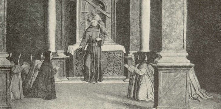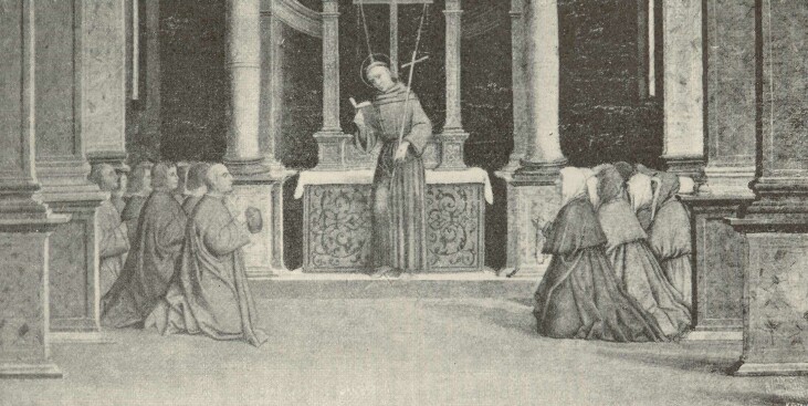 Nem kevésbbé szorul találóbb meghatározásra a 164. sz. kis temperakép, amely most Domenico Morone műveként szerepel. A legtisztább quattrocento-stílus jellemzi ezt a pompás kis festményt. A kezdetleges művészet nagy egyszerűsége párosul itt az érzés komoly tisztaságával. Háttal az oltár felé fordulva áll előttünk assisi szt. Ferenc. Térdre hullva, figyelmesen hallgatják őt a hívők, néma lel-kesültség közepette imára kulcsolva kezüket. Bizonyára nem intő szózat az, amit nékiök mond, mert a boldogság mosolya sugárzik arcáról. S bizonyára nem a szentírás homályos szakaszait magyarázgatja, mert jobboldalt a jámbor nővérek, baloldalt szerzetes testvérei sokkalta mélyebb elragadtatással, sokkalta bensőbb meggyőződéssel hallgatják. A szegénység apostola inkább evangéliumi életet hirdet, lemondást a földi javakról. Adj túl mindeneden, juttasd a szegénynek s kövess engem. Et spiritus et sponsa dicunt: Veni! Az ő szelleme lengi át az egész képet. A felfogás szűz gyermetegsége finom lélekösmerettel párosul itt. A veronai múzeumnak van egy képe, amely a kompozíció rendszerében csaknem azonos ezzel. Deszkára festett tempera ez is, méretei is csaknem azonosak a mienkével.30 Míg nálunk szt. Ferenc prédikációja az ábrázolás tárgya, addig a veronai kép a szerzetesi szabványok átadását mutatja. A mellékelt reprodukciók fölöslegessé teszik, hogy közelebbről megvilágítsuk az eltéréseket és egyezéseket. Vajjon egymás párjának tekinthetjük e két képet? Avagy az egyik a másik mintájára készült-e? Azonosnak mondható-e művészi eredetük?