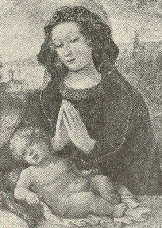 Három kis képét köszönjük Pulszky vásárlásainak. Az egyik Madonna a gyermek Jézussal és Jánossal, mintegy negyed-életnagyságban, 179. sz. a. gyakorlottsággal komponált, jellemzetes, eredeti, jó karban levő kép; a fejek mintázása derekas, a Madonna jobb kezének gesztusa jellemzetesen reá vall, épp úgy sajátos vörös színe is, amely közötte áll a karminnak és cinóbernek és a művész fejlődésének korai s középső időszakára oly karakterisztikus. Kései idejében elhagyja ezt a téglaszínt, palettáján a hamuszín veszi át az uralmat, s a maniera cenerina e korszakából való művei a legbecsültebbek.
