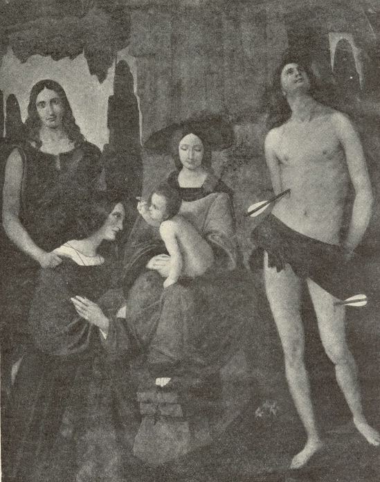 A madonna arca az előkelő úrnőé, Beltrafiio ugyanazt a típust - kerekebb orcával ismétli a Lochis-gyűjtemény 114. számú tondóján (fot. Taramelli). A kezét áldásra emelő gyermek Jézus alakja Leonardo sziklabarlangos madonnájáról való, csak kissé előbbre hajlik, ugyanonnan való a sziklás szakadék is. A megkötözött sz. Sebestyén karcsú és gyöngéd ifjú, ez magában véve még leonardesco vonás. E szentet a művészet régibb korszakaiban tudvalevőleg idősbb harcosnak ábrázolták és midőn a mezítelen test iránt való érzék megerősödött: lassankint átalakították a keresztény művészet ifjú Apollójává. Az én érzésem szerint ez a patetikus és a víziók boldogságát sejtető sz. Sebestyén, sajátságosan hat ebben a környezetben és epekedő alakja Peruginóból való emlék. Michele Marini-nek sz. Sebestyén-szobra a római S. Maria sopra Minerva-ban például azonos alak a mienkkel. S Beltraftiónak ezért nem kellett éppen Rómába mennie - - ami különben be-bizonyítottnak vehető —, mert Peruginót ösmerték s ünnepelték Paviában, Cremonában, Velencében, Firenzében is. Vessük össze a mi alakunkkal Perugino sz. Sebestyénét ama madonnaképen, amelyet a Fiesole-beli S. Domenico-templom számára festett - - most az Uffizi-gyűjteményben — s amelyet nevével és az 1493-as évszámmal jegyzett.43 Nem véletlen, hogy Vasari ezt a sz. Sebestyént rendkívüli dicsérettel halmozza el, mert Perugino művészi érzésvilágát épp azon időkben fogadta magába egész Közép-Olaszország, bár ő maga művészetének delelő pontján immár túl volt. Vagy gondoljunk a Louvreben levő Apolló és Marsziasz folyamatos szép vonalaira. Nemcsak az alak átérzésében, hanem még külsőségekben is - - hogy például bal lábát hátrahelyezi - Perugino követését, Perugino utánérzését látjuk a mi sz. Sebestyénünkön.
