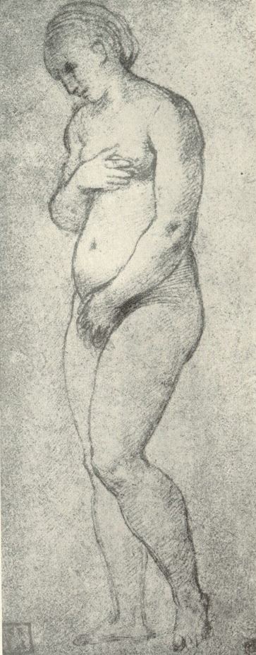 Több rajz maradt fönn, amelyeket e képhez készített s amelyeket Moreilinek1 és Friz-zoni dr.-nak57 kellett Sodoma számára visszafoglalniok, mivel hogy valamennyiüket Rafaelnek tulajdonították. Ezek: Tollrajz Roxane nyoszolyájához, három puttóval a baldachinon, Oxfordban 177. sz. a.; első, könnyedén árnyékolt vázlata. Roxanenak, Himeneosszal és Hefaisztonnal, tollvázlat az Uffizi-gyűjteményben 1479, sz. a.; egy gondosan kidolgozott vörös krétarajz a bécsi Albertinában, mezítelen alakokkal és puttókkal, amelyet még Passavant is Rafaelnek tulajdonított, végre pedig egy minket kiválóan érdeklő ezüstceruzarajz, Roxane alakja, ruha nélkül s állva, amely egykor az Esterházy-gyűjteményé volt, most pedig a Szépművészeti Múzeum tulajdona. Pulszky ismertette ezt Raphael Santi in der ungarischen Reichsgalerie című tanulmányában,58 még pedig mint Rafael eredeti művét. Ő maga hangsúlyozza, hogy mennyire egyezik a fej, a felső test, a bal kar mozdulata s a formák teltsége a bécsi (Albertina-beli) Roxaneval, csakhogy ő ragaszkodott ahhoz is, hogy a bécsi vörös krétarajz Rafael munkája, bár nem volt előtte ismeretlen (1. a 339. L), hogy Morelli felszólalt ez attribució ellen. Lermolieff azután - - s vele csaknem egyidejűleg Frizzoni dr. is - - a budapesti rajzot is Sodomának tulajdonította, ami kétségbevonhatlanul találó. A nyilván élő modell nyomán készült rajzon ugyanis megvannak Sodoma jellemző bélyegei: a vonalak sűrűsége, a telt és kerek térd, a hegyes ujj, a láb erős nagyujja. A rajz nyilván Roxarie alakjának egy koraibb konceptusa, mert a kivitelre került képen Roxane felkel ültéből, hogy vőlegényét fogadja.