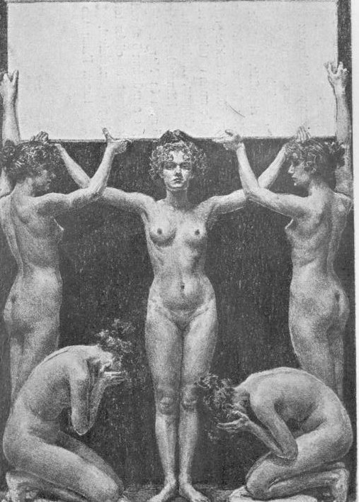 Paczka Kornélia még Rómában hozzálátott, hogy egy egységes rézkarc-sorozatot alkosson, amelybe az imént említett "Maria mater con-solatrix" csak mint egy rész volt hivatva beleilleszkedni. Úgy tervezte, hogy ez a sorozat szimbolisztikus kifejezése legyen a nő lényének. Két, ebbe a sorozatba szállt és megkezdett nagy rézkarc ("A leány és a képzelet", "A nő a chaosban") tönkrement. Miután a művésznő a rézkarcot nem győzte egészséggel, abbanhagyta. E helyett még nagyobb tervre szánta rá magát és elhatározta, hogy ezt a témát hat kolosszális fesményben fogja megoldani. A festés teknikájában az ura által támogatva, ez a hatalmas megfestett szimfónia részben még Rómában, részben pedig az első berlini időszakban létre is jött, de befejezve nem lett. Eddig az egésznek csak egyes részletei kerültek a nyilvánosságra. Ezeknek a többször is megfestett képeknek egyes motivumait a művésznő ezenkívül már a nagy koncepcióból kisarjadzott önálló művekre is felhasználta. És mindezekhez a munkákhoz a részleges vázlatoknak és tanulmányoknak csodálatosan bőséges sokasága készült. És bárha le kell mondanom arról, hogy ennek a nagy sorozatnak a képeiről, amelyek eddig csak részben kerültek a nyilvánosságra és előttem is csak részben ismeretesek, ítéletet mondjak, mégis szabad tán kiemelnem azt a ragyogó rajzbeli erőt, mely a vázlatokból és a tervezetekből kisugárzik. A mozdulat-motívumok szinte végtelen sora bámulatba ejti az embert. A mindig másképen beállított csoportok mintha a képzelet kiapadhatatlan forrásából fakadnának. Emellett művészi törekvésének a központjában mindenkor a meztelen emberi test áll. Alig van még egy élő művésznő, aki, betekintést engedvén a rajzfüzeteibe, a legremekebbül megrajzolt aktoknak ilyen sokaságát mutathatná föl, amelyek hol krétával és szénnel nagy lapokra, hol kihegyezett ceruzával apró papirszeletekre odavetve: valóságos végtelen melódia az "Ember, az emberkék és az asszonykák" thémája fölött - lévén az utóbbiak, amint illik is, többségben. Ilyenkor látja csak az ember, hogy hányféle "állás", "fekvés" képzelhető és hogy az ember eddig még semmit se tudott.