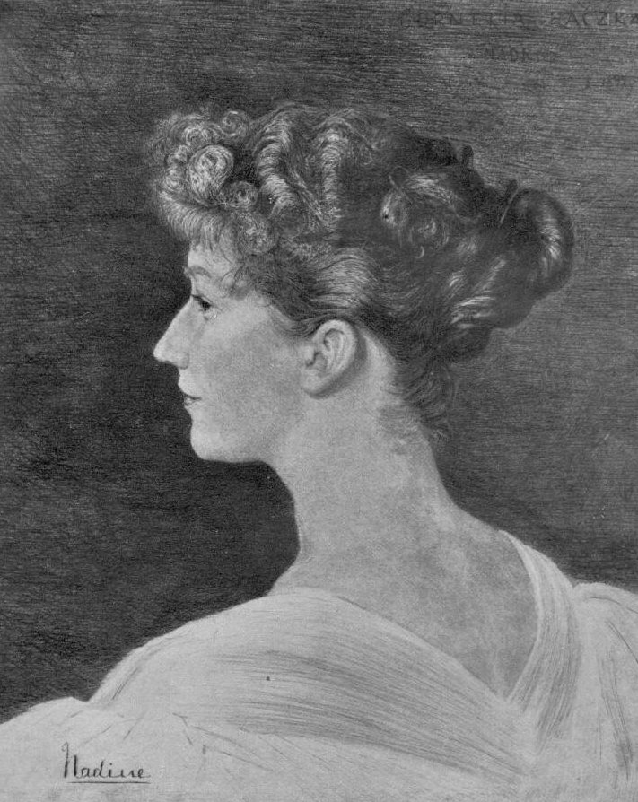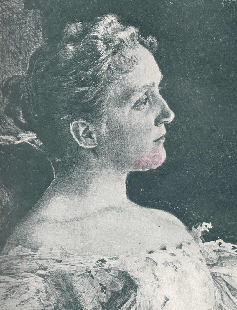 Most pedig mindenekelőtt az arcképeire kell rátérnünk. Mesésen sikerült neki fivérének, dr. Wagner Frigyesnek 1900-ban készült és szélesen odavetett arcképvázlata, mely a fej tartalmát teljesen kimeríti. Szép sikert arattak a berlini kiállításokon ifjú sógornőjének, Margitnak életnagyságú arcképe, az ő szeretetreméltón sensitiv arcvonásaival és dús. de rövidre nyírott és amellett érdekesen fehéres hajával. Míg Jászai Mari arcképében, mely felfogásban nagyon is emlékeztet az urának fönnebb említett Jászai arcképére, mint utánérzésben, nem tudok zavartalan gyönyörűséget találni, annál jobban kielégített Kammererné kiválóan szép képmása.