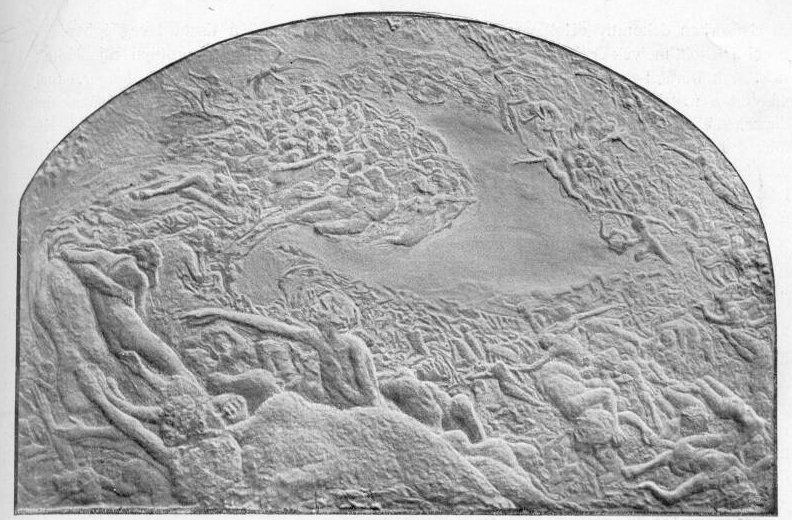 A művésznő harmadszor is nekifogott ennek az egész lényét betöltő problémának a megoldásához, amikor egy óriási csészeformájú kutat tervezett, amelynek gazdag, plasztikus díszítésében akarta tisztultan kifejezésre juttatni azt, ami a képzeletében előtte lebegett. A szobrászat technikája úgylátszik semmi nehézséget sem okozott neki. Nem kellett küzdenie vele, mint a színnel. Persze egy mélyértelmű alkotásról van szó. És sok esztendő komoly munkájáról. A kút bronzban van gondolva. A minta gipszből van. És az alakokat — mint a kép mutatja — a művésznő a keménynyé vált gipszből akarja kifaragni. Ez, a kényelmes, agyagból való mintázással szemben, elragadó üdeséget, élességet és tökéletességet kölcsönöz neki. A hat dombormű közül, mely a kutat, annak a festett sorozatnak megfelelően, díszíteni hivatva lesz, az egyiket, mely részben már készen van és körülbelül egy méter széles lesz, a "Chaos"-t, képben is bemutatjuk olvasóinknak. Dante-szerű, látnoki fantáziával mutatja be ezen a művésznő előttünk ember-tömegek táncát, az emberi nemnek szemeink előtt felvonuló, szinte beláthatatlan vonulását: mint felhők gomolyognak a csoportok, szélvész kap bele a nagy kavarodásba, mint ködszalag vész bele a tömeg hullámzása a végtelenbe. Szinte álomszerű az egész, mintha egy egész világnak vágyakozása, epedése és sóhajtozása volna! Ez az összbenyomás. De az élesebben fürkésző szem legnagyobb meglepetésére, fölfedezi, hogy ez a látszólagos "Chaos" a legszabatosabban kidolgozott egyes tanulmányokból van összerakva, amelyek ott pihennek a művésznő mappájában, s amelyek közül egy ceruzarajzot olvasóinknak is bemutatunk. A motívumoknak szinte beláthatatlan gazdagsága tárul elénk. És én nem habozom kijelenteni, hogy ez a dombormű, mely persze megint csak egy része a nagy egésznek, előttem a legtökéletesebbnek látszik, amit csak a művésznő eddig alkotott. És elsősorban az indít engem erre az ítéletre, hogy itt elérve látom azt is, amit -mint fönnebb említettem — a művésznő mint fődolgot kíván szerepeltetni. Adja Isten, hogy ez a hatalmas alkotás necsak a minduntalan visszatérő gondoknak forrása legyen a művésznőre nézve, hanem egyúttal az erő forrása is, jobban mondva, az "Élet kútja", amelyben a képzelete és magasan szárnyaló elszántsága állandóan megifjodhassék.