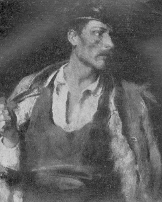 A látogatók közt a legszuggesztívebb hatást a földre lenéző szűrös ember kelti, akinek kifejezéséből úgy érezzük, hogy több, mint betévedett, barát vagy rokon, mindenesetre olyan, akinek szíve az elítéltért érez. A tanulmány formaelemzés, a képen a tónusba olvad minden, a tanulmányon kezét állához szorítja, a képen feje aláhull, keze energiavesztetten lehanyatlik, - - a kifejezés, a komor magábamélyedés intenzitása nőtt. A másik, pipáját görcsösen szorító mesterember, amint az elítéltre néz, pöckösen, csakúgy félvállról, a megindulását nem leplezheti el. A tanulmány nagy szeretettel készített texturahatás, a bekecs bőre, a prém, a bőrkötény mind külön-külön éreztetve, de az egész nem színben, hanem tónikus értékelésben. A képen a folt elrendezés szempontjából a sötét tömeget megszakító fehérre volt szüksége és így a kovács levetette bőrkötényét, hogy ingben álljon ki, melyet a lecsüngő nyakkendő ment meg az unalmas egyszínűségtől.