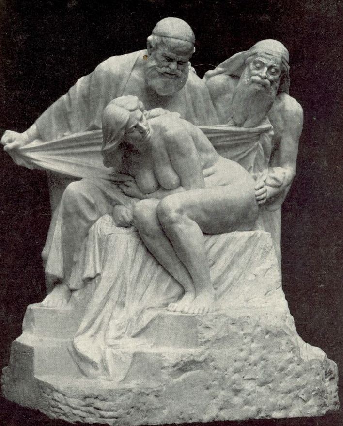Új területen mutatja Rónát az Erkel-síremléknek a Kerepesi-temetőben levő finom, hangulatos nőalakja. Közben belefárad kissé a monumentális, az elgondolás stádiumában maradó tervezgetésekbe Még a budapesti Kossuth-pályázat 1907-ből való mintája előtt elkészül, 1903-ban az aradi Szent-Háromság-szobor, visszatér az öreg-ember-probléma Anacreonnak ebből az időből való aktján. A most elmúlt évben pedig a nagy kompozíciók helyett kisebb tömegek zárt formáinak finom fordulataival foglalkozik ismét. Két tárlaton egymás után állítja ki "Zsuzsanna" és "József a Potifárné felesége előtt" csoportjait. Az elgondolásnak és a megcsinálásnak hasonlósága köti össze a két művet. Nem a bibliai téma adja meg a közösséget. Ennél erősebb kapcsolat, hogy mind a kettőnek központja érett formájú, érzékien kifejlődött asszony; a biblia két erotikus jelenetével van vonatkozásban mind a kettő és ezt az ero-tikumot, mely minden időben izgatta a művészi érdeklődést, a puha, ruganyos alapú bőrfelület eleven remegését, az arcokon, az izmokon, minden porcikán megnyilatkozó, szinte villamos feszültséget adja vissza. Mind a kettő sajátos anyaghoz alkalmazkodik. Zsuzsanna márványszobor, talán fél életnagyságú, éppen mint a hársfából faragott József és Putifárné. A márványtömb, amelyből készült, sokáig hevert a művész műtermében, sokáig szemlélte, forgatta, próbálta és hozzá mérten készült el az anyagminta; a kész anyagba belekomponálva jött létre a mű. Rajta a fürdő nő után leskelődő két öreg karakterisztikus, erőteljes feje. Emlékeztet a faun-fejekre, felidézi a művésznek a túlérett formák iránt való szeretetét és megértjük, hogy e duzzadt, változatos tömegekben dekorativ szépségeket talál, ha arra gondolunk, mennyivel változatosabb, lendületesebb a vadszőllő levele hervadt, rótt, félig összezsugorodott korában, mint zöld, friss, de még merev növekedése közben.
