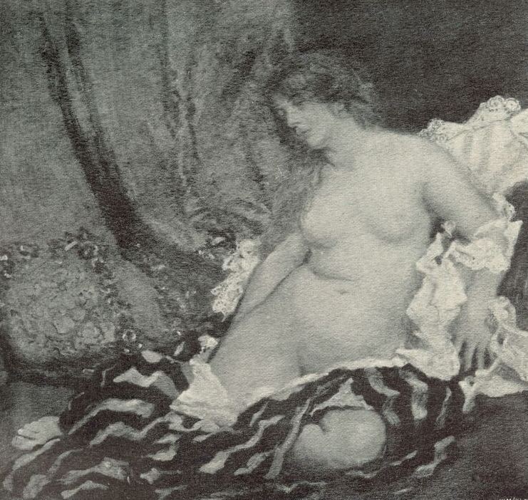 Az első kísérlete még egyszerű. Finom selyemfüggönyös háttérrel, szőnyeges ottománon félig fekvő helyzetben ül egy nő, s e milieu-ből kicsillog meztelen testének email-ja. A virtuóz aktfestő, a pleinair-iskolában megerősödve, nagy egységekben látja a halálos biztonsággal ösmert és éppen azért kitűnően leegyszerűsített formákat. Itt a szintézist egy Lucien Simon bravúrjával -- kissé az ő színharmóniájában is - vitte keresztül. Talán még ennél is tökéletesebb a Műteremsarok (1905).3 Finom és egységes műterem világítás fényében látjuk a perzsaszőnyeges díványon heverésző aktot és az előtte álló - - a színbenyomást vizsgáló -- festő visszatükröződik a tükörből. Minden forma színfoltokból alakul ki, - - egységes és harmonikus és erotikus nyugtalanságtól mentes. Az akt rövidülése szemkápráztatóan biztos s a tükröződő alak színértékei virtuózán igazak s az egész — mint a lokális szinek finom harmóniája - - széles előadásában igazán mesteri egybefoglalás.