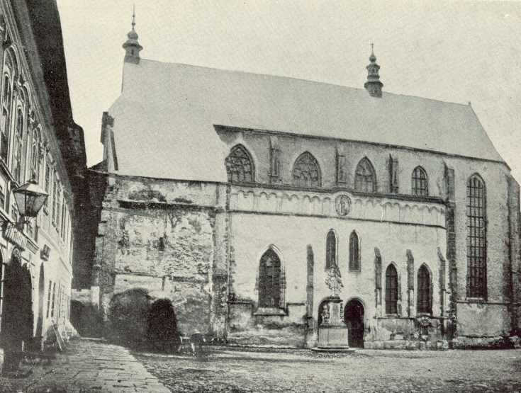 Ezt a renaissance homlokzatot a templom napjainkban történt restaurálása alkalmával, mint "nem stílszerűt" lebontották. Régi fényképe arról tanúskodik, hogy sokkal jobban illett a főhajó déli homlokzatához, mint az előtte most terpeszkedő formátlan téglatető, s hogy egyenes vonalban záródó oromfalát, mely a déli mellékhajó tetejét elrejtette, kettős félkörívekkel betetőzött zömök félpilléres árka-túrák tagolták. Ezek közül a kapu fölött lévőt Szent Egyed püspök festett alakja töltötte ki. Hogy azonban a Felsőmagyarországra nézve jellegzetessé vált új stílusban a lengyel határtól távolabb eső központibb fekvésű vármegyéinkben már jóval korábban építkeztek, mint Bártfán, sőt talán korábban, mint Lengyelországban is, ennek a besztercebányai vár pretoriuma: régi városháza a bizonysága. Ez eredetileg hátsó homlokzatával a már régebben lebontott várfalhoz támaszkodott ; szabadon álló három oldalán, a félemeleti ablakokkal áttört, talapzatszerűen kiugró földszínt fölött rendkívül derűs hatású félköríves oszlopos folyosó övezte, amely két felől még ma is ép állapotban van meg. A folyosó eresze fölött, a második emelet gyökeres átalakításon esett keresztül, szintúgy a tető is. Hogy milyen volt eredetileg ez az épület, s hogy 1520 előtt már fennállott, ennek a besztercebányai vártemplom déli falába foglalt s Krisztust az olajfákhegyén ábrázoló kődombormű a bizonysága, amely kompozíciójában, alakjai formáiban még a csúcsíveskori művészet szellemét tükrözteti vissza s alighanem már a XVI. század elején, de legkésőbben 1520 körül már készen volt. Ennek a domborműnek naturalisztikus tájképi hátterében bal felől még ma is ott láthatjuk a besztercebányai régi pretorium miniatűr mását, még pedig eredeti állapotában, második emelete felett emeletnyi magas ormafallal, amelyet párkányán fantasztikus ormokból összenőtt koronázat tetőz be.