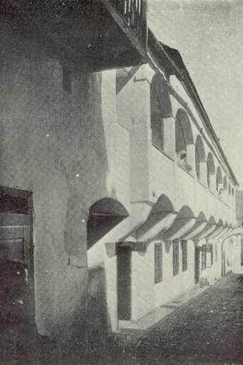 Ilyen loggiákkal, avagy gyámkövek során nyugvó formás árkádos folyosókkal Besztercebánya mellékutcáinak, néhol hihetetlenül kicsiny udvaraiban is lépten nyomon találkozunk. S a legtöbb helyen ma már csak ezek az udvarok tanúskodnak arról, hogy a ház valamikor renaissancestílű volt Hogy ebben a ma is rendkívül eleven és művelt bányavárosunkban a renaissance stílnek felsőmagyarországi változata volt általános, erre a Főtéren és a mellékutcákban egyaránt a házak legfelső emelete enged következtetést. Ezek legtöbbjén nyilvánvaló, hogy a háborús idők elmultával a tetőt védő emeletnyi magas oromfal felhasználásával építették ; sőt számos házon a legfelsőbb emeleten pusztán vakablakok vannak s az így átalakított régi oromfal mögött még ma is az eredeti félereszű tetőt láthatjuk. Ilyen átalakított oromfal van a Főtér 3. számú házának homlokzatán, amelynek udvari szárnyán festői hatású árkádos folyosó fut végig. Ez a ház szomszédos Besztercebánya főterének egyetlen, nagyobb átalakítástól homlokzatán is ment maradt épületével, melyet emeletnyi magas oromfalának attikáján egymásl metsző félkörívek frízébe foglalt lőrések törnek át.