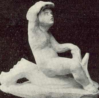 A másik szobrocska delfinen nyargaló Ariont ábrázol. Ha ugyan Arionnak nevezhetjük ezt a kis kövér puttót, holott a bűvös dalnok rendszerint meglett férfi alakjában szerepel, kezében a szinte nélkülözhetlen lanttal s ez a szobrocska híján van annak is. Mégis a kis fiú mozdulata, amint bal kezével az életmentő delfin szájába kapaszkodik, jobb kezét pedig a szeme fölé tartja, mintha a várvavárt szárazföld megpillantására vágynék, - - a felfogásban az ismert görög regéhez fűződik.