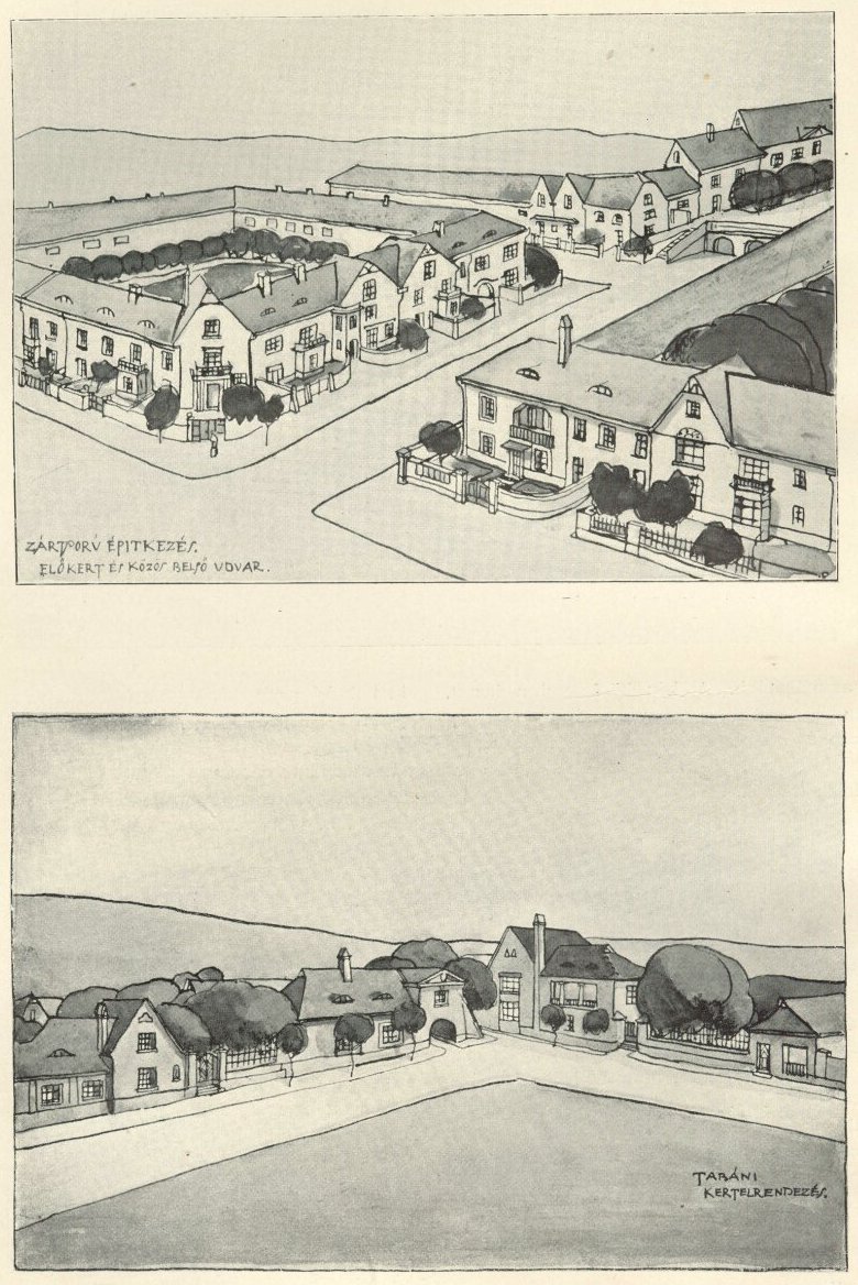 Mert beépíteni egy telket és pláne több telket együtt, ahogy az itt szerencsére mindenütt lehetséges lesz, igen sokféleképen lehet, a kertet és a házat igen sokféleképen lehet elosztani a telkeken és ez a munka döntő a városrész jövendő szépsége és praktikussága szempontjából. Hivatalos városrendezésünk háromféle beépítő móddal szokott volt dolgozni; első a zárt sor, melynél az udvar a telek belsejében szokott elhelyeződni, másik a zártsorú élő-kertes építkezés, szintén belső udvarral mindegyik házban külön, harmadik a kertes villaépítkezés, melynél a villát lehetőleg a kert közepére állítják. Már ezek a beépítési módok is, kis körültekintéssel igen különbözőképen kezelhetők. A zártsori építkezés sokat veszíthet ridegségéből, udvarai barátságosakká válhatnak, ha nagyobb telekkomplexumra közös nagy udvart állapítunk meg és azt fasi tjük, gyöpösítjük. Ez a rendszer ajánlható a Tabán legalsó részein, ott, ahol a családi ház rendszerre való áttérés túlsók pénzébe kerülne a városnak, de alkalmazni kellene a pesti bérkaszárnyanegyedekben is, mindenütt, ahol még lehetséges. Azt az anyagi veszteséget, amit az udvari szárnyak elhagyása okoz, bőven lehetne pótolni valamivel nagyobb emeletszám engedélyezésével, ami mindenesetre nem volna oly egészségtelen, mint a mostani kisudvaros bérházelrendezés, mely többek közt valósággal melegágya a tuberkulózisnak. Segíthet a zártsorú építkezésen az előudvaros elrendezés is, ha az udvarokat elég nagyra méretezzük. Ezeket a beépítéseket a körülményekhez képest sokféleképen variálhatjuk és bár higiéné szempontjából nem érik el a családi ház előnyeit, mégis nagy megjavítását jelentenék a mostani bérházrendszernek.