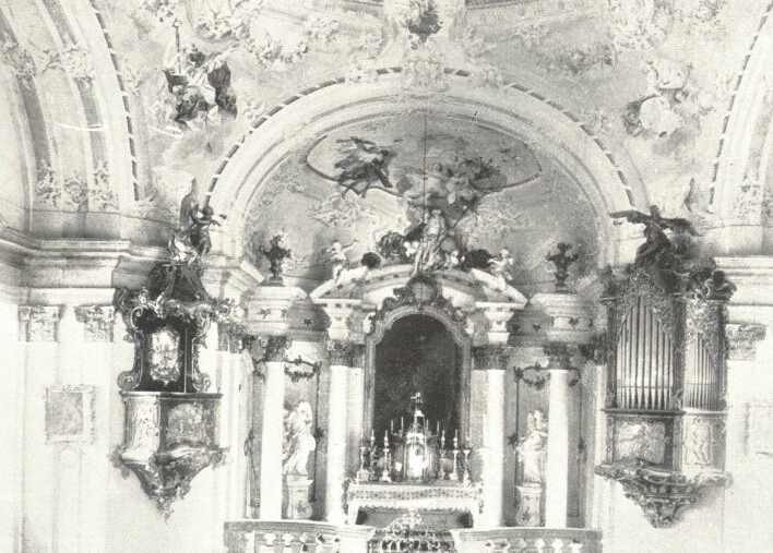 A szentély két felén a kupolapilléreken függ a remekbe faragott szószék és az orgona háza. Az előbbit alján Krisztus siratását, születését s tizenkétéves korában a templomban, ajtaján feltámadását ábrázoló aranyozott domborművek díszítik, mennyezetén két angyal lebeg a tízparancsolat táblájával kezében. Az orgonaház három domborműve Szent Ceciliát ábrázolja két zenélő angyal között. A kupola bejárat felőli két pillérén felhős gyámköveken két nem kevésbbé művészies stucco-szobor-csoportozat van: Nepomuki Szent János, amint a királynét gyóntatja és az alamizsnát osztogató Szent Jánost. A kupola csarnokához fűzött kát oldalkápolna oltárait angyalos stucco-keretbe foglalt figyelemreméltó olajfestmények díszítik. Jobbfelől páduai Szent Antal, balfelől assziszi Szent Ferenc képe. Mind a kettő alatt egy-egy rokokó cikornyás üvegkoporsó áll az oltáron. Az egyikben Szent Deodát mártir csontváza fekszik aranycsipkés ruhában, negédes pózban ; a másikban három üveges dobozban szent ereklyék láthatók. A szentéllyel szemben levő falon a félemeleti oratórium nyílását aranyozott, cikornyás keretbe foglalt hármas ablak zárja el. Az oratórium bejáratával szemben gazdagon faragott és cikor-nyáiban szintén aranyozott gyóntatószék áll. A kápolna oldalfalai, mint ezek plasztikus stucco-díszítése is, fehérek; a boltozatától azonban szinte végesvégig játszi könnyedséggel odavetett, leheletszerű finomsággal színezett falképek díszítik, amelyek szelíd harmóniájából csak itt-ott csendül ki egy-egy erősebb hatású színfolt. Ezeknek a falképeknek a festője nem kisebb mester volt, mint a bécsi Maulpertsch (1724—1796), akinek magyarországi működésével nálunk már többen foglalkoztak.1 Legnagyobb méretű s a sümegi plébánia-templomot, az egri líceum kápolnájának mennyezetét, a székesfehérvári karmelitáknak ma a papnevelővel kapcsolatos templomát, a győri és a szombathelyi székesegyházak boltozatát díszítő falképei mellett a bogoszlói kápolna mennyezetképei kisebb arányúak, de Maulpertschnek távolról sem utolsó munkái, sőt élete virágjában és java erejében tárják elénk a mestert, aki közvetve Tiepolo tanítványa, helyesebben követője volt s aki itt 1763-ban dolgozott.