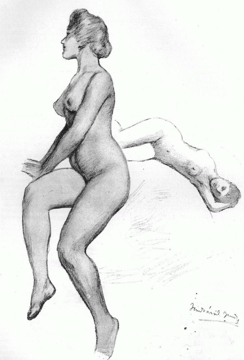 E több mint húszesztendős dátumot mutató kép közvetlen szomszédságában újabb, más karakterű, vagy most készülő képek sorakoznak s közülök meg kell említenünk egy kompozíciós hármas képet. Részben azért is, mert nem fog kiállításra kerülni, hanem egyenest odajut, aminek a némi szemmeltartásával formálódott. A Jendrássik-féle klinika valamelyik termének falát fogja díszíteni, s az orvostudomány ókorát, középkorát és modern idejét akarja mintegy illusztrálni. Anélkül azonban, hogy úgynevezett szimbolikus festmény volna. Három piktorilag kifejezhető jelenetet mutat. Az egyiken Hippokrates, az ókor tudós orvosának megtestesítője, a mai orvosok nagy őse "konzultál", a másikon egy feketeruhás alak fogja egy sárga bársonyban pompázó delnő pulzusát, különös színű folyadékot tartva magasra. Ez volna a középkor orvosa. A harmadik s méretre legnagyobb képen pedig egy modern klinika terme van előttünk, formás, fekvő női testtel s körülötte figyelő orvosok, maga Jendrássik egyetemi professzor, asszisztenseivel. Mindenesetre, igazi elemében ott lesz, ahová terveződött, fönt a klinika falán. Érdekessége s egyik értéke az is, hogy ez utóbbin az orvosfejek egyben mind hű és jellemző portrék.
