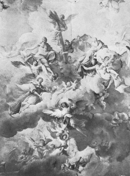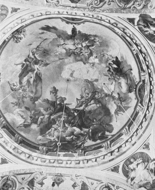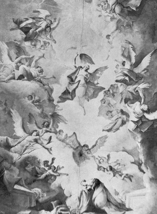 A tagolatlan nagy felületeknek a festészet eszközeivel való architektonikus kiképzése -a Sixtus-féle kápolna óta a mennyezetfestők fontos problémája — elég szerény. A boltcikkelyek fölött hatalmas párkány vonul körül: e fölött már a festészet birodalma kezdődik, mennyei régiók nyílnak meg. A fél pillérek fejei fölött, a boltcikkelyek között, tömör, erősen bárok ízű architektonikus keretben egy-egy fülke van festve, amelyben, kiugró konzolon, egy-egy ülő alak foglal helyet: a négy evangélista a szentélyben, négy próféta a hajóban.