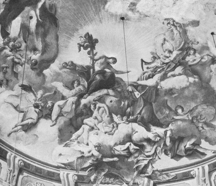 Nagyobb méretű, gazdagabb kompoziciójú a középső kupolában lévő festmény, amelynek eredeti jellegét — úgy látszik- — az ismételt helyreállítás inkább megkímélte. Szent Erzsébet apoteozisa: a szent közeledik a mennyekben trónoló Krisztus felé, aki sugárzó dicsfénnyel koronázza meg őt. Ez a főcsoport, amely körül nagy számmal mozognak a mennyei seregek. Ujjongva zenélő, felhőkön ülő, felhőket emelő, rendező nagy angyalok, akik közül kettő Krisztus keresztjét tartja. Mozgalmas tömegek mindenütt, a felhők nehéz gomolyokba tömörülnek és az égnek aránylag csak kis részét hagyják szabadon. Az alakok a térhez képest nagyméretűek és az egészben a testiség hatása uralkodik, míg Tiepolónál és követőinél inkább a könnyebb légkör, benne szabadon lebegő kisebb alakokkal jut érvényre. Jellemző, hogy a XVIII. század második felében a hasonló kompozícióknál nélkülözhetetlen felhők kevésbbé tömör, inkább szétfoszló alakban fordulnak elő.