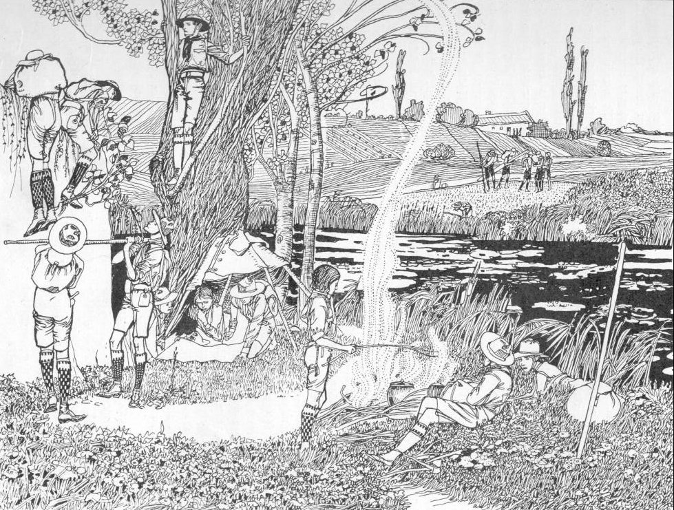 TÜNDÉRVILÁG A VÁROSLIGETBEN. Ifjúsági regény. Irta: özv. Báthory Nándorná. Rajzolták: Nagy Sándorék. Budapest, a Szent István Társulat kiadása. - Ifjúsági irodalmunk művészi kiállítás dolgában évről évre javul. Annak az időnek régen vége van, amikor külföldi tucatba készült kliséket nyomattak le a kiadók s rögtönzött magyar szöveget csapva hozzá, megvolt az ifjúsági irat. Részben a kiadói viszonyok fejlődése, részben arra való művészek fellépése adta meg a mai e nemű termelésnek a karaktert s e munkából bőven kivették részüket Nagy Sándorék, akik már egy háromkötetes mesekönyvet is illusztráltak régebben. Most Báthoryné nagyon kedves szövegéhez rajzoltak képeket s a képeken kivül fejléceket és záróvignettákat. Valóban művészeti értékű munka támadt ebből az együttes munkálkodásból. Minket e helyen természetesen első sorban a rajzok érdekelnek s ezekből mutatóba közlünk is egyet, a Cserkész-táborozás cimüt, amely jó fogalmat ad az egész könyv illusztrációiról. E képek varázsa nemcsak a bensőséges, naiv hangban rejlik, hanem abban, hogy az előadás a témát belefonja az ornamentumba: kettős mesebélyeget juttatván neki. Valóban, egyike a legszebb könyveinknek ez az újdonság. Ára 10 K.