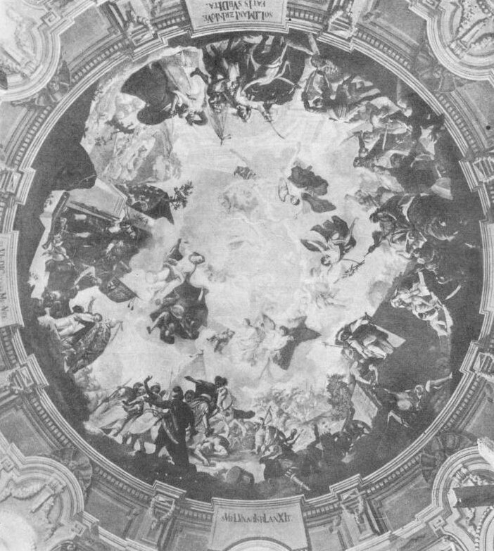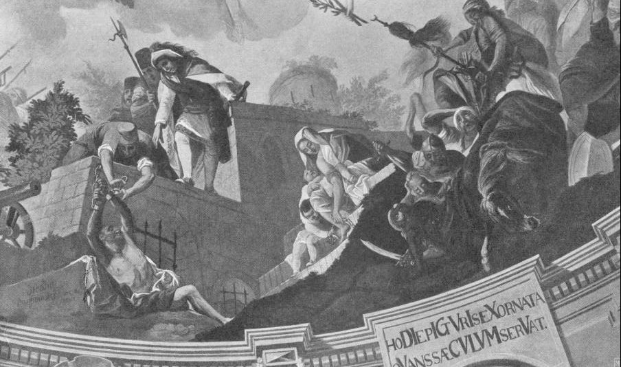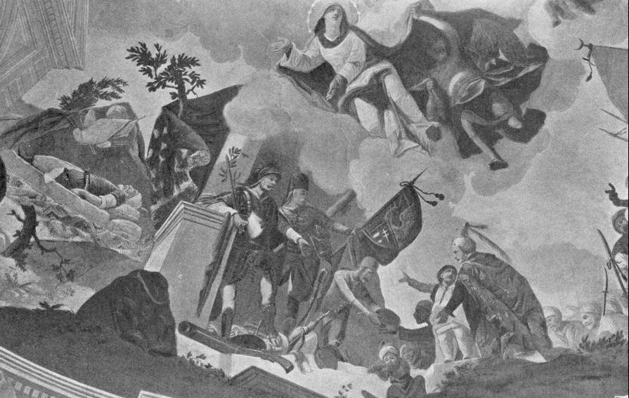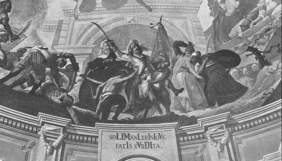 Zrínyi halála, aztán Szigetvár visszavétele volt a két fő motivum, amit, bár időrendben távol estek egymástól, itt egybe kellett komponálni s e földi jelenetek a kupola közepét elfoglaló égi jeleneteket mintegy koszoruszerüen övezik. Az egyes részek leírása helyett azok képét közöljük itt.