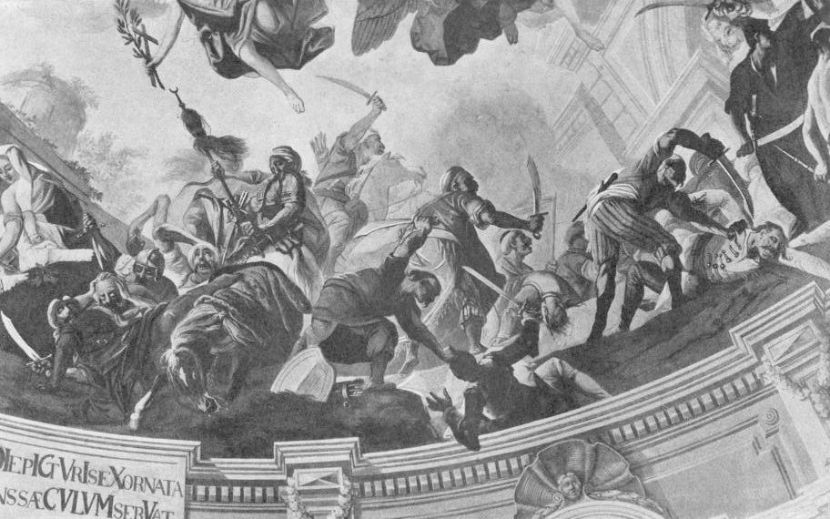 A névjelzéssel és évszámmal is ellátott terjedelmes freskó a szigetvári plébániatemplom kupoláját borítja és fő-ékessége ennek az egyháznak. «Könnyen érthető és méltányolható gondolat volt, hogy midőn Szigetváron a katolikus templommá vált török mecset kupoláját óhajtották festményekkel díszíteni, nem érték be a szokásos menyei jelenetek ábrázolásával, hanem ott kivánták látni a vár történetének legfontosabb mozzanatait is».