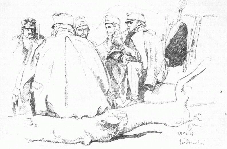 A lövészárkok ellen rendezett szuronyroha-mokat kivéve, a harc a láthatatlan ellenség ellen folyik. Nagy távolságokról jön a srapnell, a fedezék a lényeg és a katona élete ott folyik le a lövészárokban. Ezek a jelenetek kapták meg a harcvonalban élő művészt is elsősorban. Odajegyezte magának a naplójába Herman is a lövészárokba vezetett telefont hallgató őrnagyát, amint mellette hanyatt fekve alszik a baka, mögötte felfigyel a másik, a telefonon érkező parancsot várva. Ezek drámai érdekességű mozzanatok, mert ettől függ sokak sorsa. S mégis, a művész érdeklődése itt nem a tárgyhoz fordult, hanem a hanyatt-fekvő katona mozdulatához, melynek széles vonala és nagy gesztusa kötötte le figyelmét és sietve feljegyezte. A mozdulat eredetisége és ereje érdekelte Hermant a béke idején is -a szeme erre volt beállítva, ezt látta meg most is. Képzelem, mennyi ilyet gyűjtött össze emlékezetében, hogy a háború után előszedhesse őket emlékezete raktárából, csupa új és kiadatlan mozdulatot, nem épen háborús tárgyú képekhez, de olyanokhoz, aminőkre ezek a feledhetetlen emlékek, a hónapokon át szerzett nagyszerű benyomások ihletni fogják. Mert - hiába, - - a művész lelke kész instrumentum, melyet semmiféle idegen hatás meg nem. másíthat, csak kicsalja belőle a benne lappangó melódiákat átformálva, átalakítva, az új hangulatok hatása alatt. A másik rajza, melyet mindjárt az első benyomások idején (aug. 12.) jegyzett fel: mozgás-megfigyelés. A láthatatlan ellenséget kémleli a fedezékből a tiszt úr, azon igyekezve, hogy ő maga is láthatatlan legyen. Ezért fordította meg a sapkáját is, hogy ne csillogjon a szemellenző. A harmadiknál is a mozgás-visszaadás a lényeges. A gúlába rakott fegyverek mellett pihennek a katonák, ülve, fekve, ledőlve, miközben az egyik szemben fekszik, tökéletes rövidülésben. Ennek a visszaadása, mely mellesleg megjegyezve, virtuóz módon sikerült, foglalkoztatta a művészt. Festő maradt ő a háborúban is, ugyanazon problémákkal terhesen védte a hazát, amelyek azelőtt a műtermében foglalkoztatták.