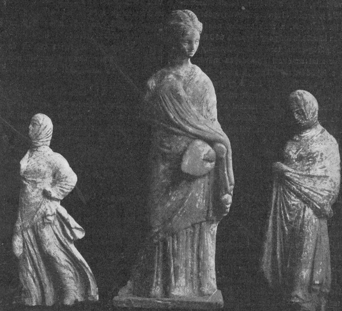 A geometriai korszak primitiv, kézzel gyúrt s a Dipylon-vázák módjára firniszfestékkel színezett pillérszerű idoljaiból és elnagyoltan megmintázott lovasalakjaiból terrakottáink között egész sorozatot -találunk. Az archaikus kor nagy technikai újítása, hogy a kézzel való mintázást a formába való öntés váltja fel. Csak a messze kinyúló tagokat és a fejet mintázzák továbbra is kézzel. Ezt a fontos változást kitűnően szemléltetik és magyarázzák azok a Tarentumból való terrakotta-formák, melyek gyűjteményünknek nemcsak a technikai eljárás illusztrációja szempontjából, de művészileg is igen becses kiegészítő részei. Különös figyelmet érdemel közöttük egy peplos ruhás nőalak és egy a Parthenon friz paripáira emlékeztető, pompás ló-fej, melyeknek formájából csak az elülső oldal maradt ránk.