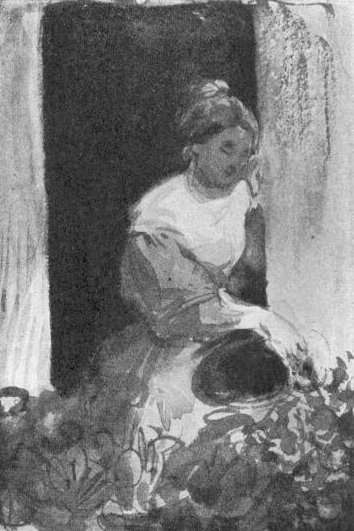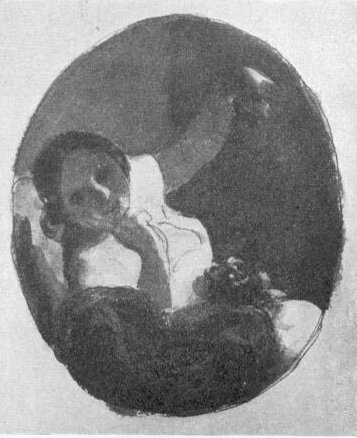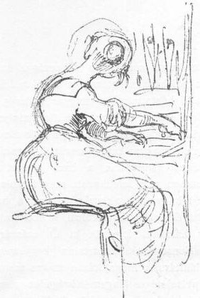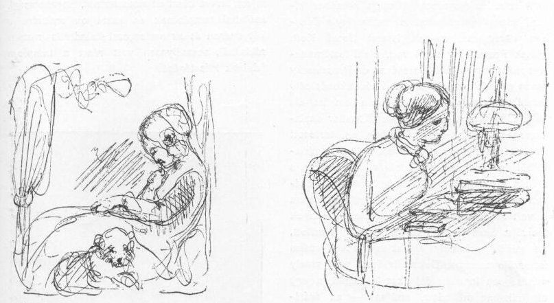 A régi, bécsi interieurök meleg emléke váltotta talán ki belőle azt a gyönyörű kis tollrajzot, melyen egy fiatal nő lámpa fénye mellett íróasztalánál ül és olvas.