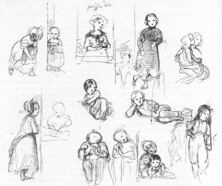 És még valami teszi ezt a «Bújócskát» különösen kedvessé: a mozdulat közvetlen bája. Jellemző Brockyra, hogy annyit képes egy mozdulatba belehelyezni, annyi édes, őszinte gyöngédséget, annyi kacagó kedvességet. A kis csöppség elrejtőzött a karosszék mögé és olyan komoly szepegássel lesi, hogy megtalálják-e, mintha a játék vége életkérdés volna ránézve ; és a nagyobbiknak a háta úgy kacag, olyan kíváncsi vígság és hamiskodó magatettetés van benne, hogy önkénytelen vele mosolygunk. Ezt a kedves kompozíciót megtaláljuk a tollrajzok nagy tömkelegében is egyhelyütt.