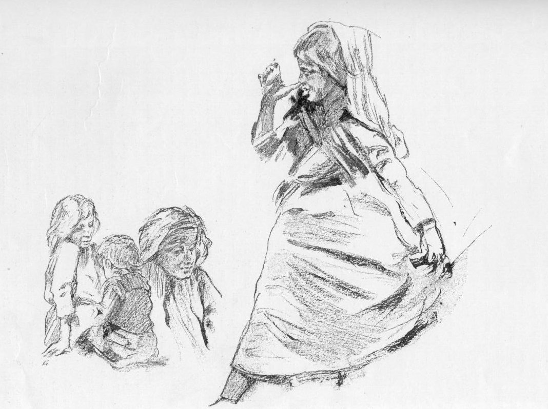 Megállapítható a rajzokból az is, hogy a színvázlat előbb készült. E tanulmányok ugyanis már nem egyebek, mint az olajfestményen látható három embercsoport részletes átdolgozásai. Kompozíciójuk érettebb, szigorúbb, tudatosabb. Ami a vásznon még lazán függ össze, az a tartalmilag gazdagon kifejlesztett ceruzarajzokon már szilárd egységgé tömörül.