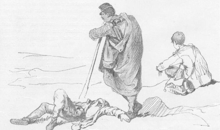 Elöl a jobb és balsarokban s kissé hátrább a középen elesett, sebesült és az utóbbiakat támogató katonák. A középső csoportban kettőről meg is állapítható, hogy pirossapkás. A rajzok mutatják, hogy a többieket is, ha — nem is mind, de túlnyomó nagy részben — honvédeknek képzelte a művész.